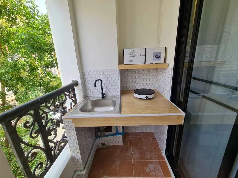 Fully furnished with built-in furniture and appliances: TV, refrigerator, air conditioner, water heater, microwave, bed, sofa, and sink.